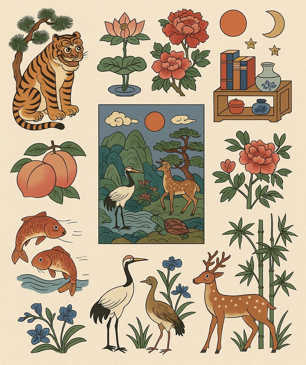 민화는 조선 후기 서민들이 즐겨 그렸던 그림으로, 궁중화나 사대부 중심의 문인화와는 다른 자유로운 미감과 상징성을 지닌다. ‘백성의 그림’이라 불리는 민화는 단순한 장식화가 아닌, 삶의 바람과 믿음, 기원을 담은 소통의 도구였다. 특히 소재 하나하나에는 오랜 세월을 거쳐 전해진 상징성과 민간신앙이 녹아 있다. 이번 글에서는 민화에 자주 등장하는 소재와 그 속에 담긴 의미를 살펴본다.