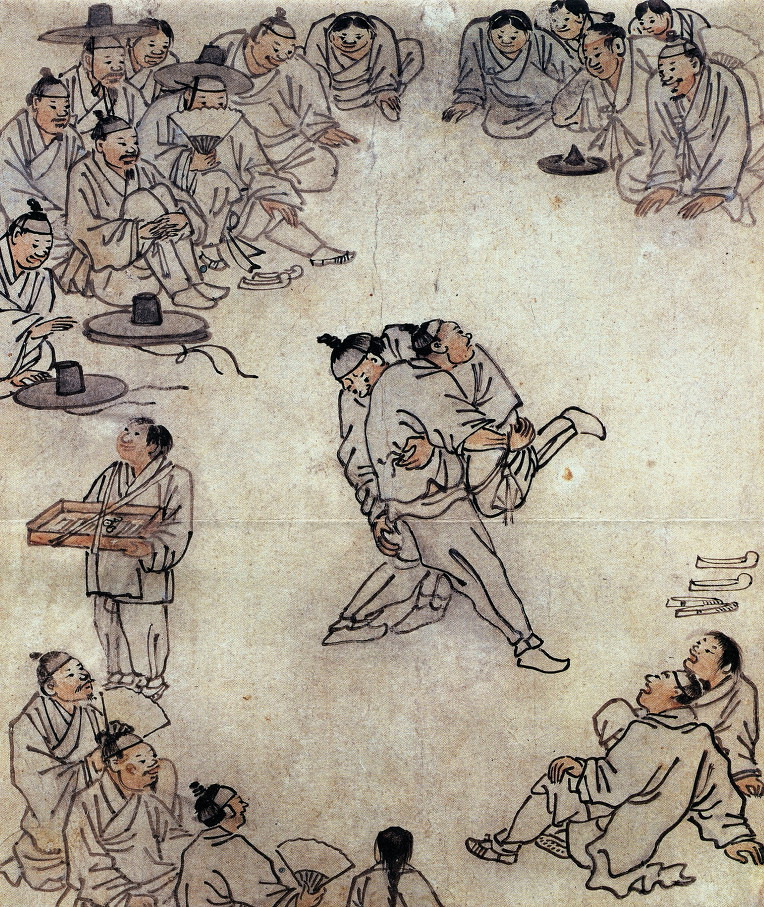 김홍도의 대표작 중 하나인 《씨름》은 그의 해학적 인물 표현이 가장 잘 드러나는 작품입니다. 근육질의 남성들이 중심에서 씨름을 벌이고 있고, 그 주위를 둘러싼 사람들은 응원하며 웃거나 놀라움을 감추지 못하고 있습니다. 관람객의 시선을 따라가다 보면 자신도 모르게 입가에 미소가 번지게 되는 이 그림은 ‘웃음의 전염’을 느끼게 합니다.