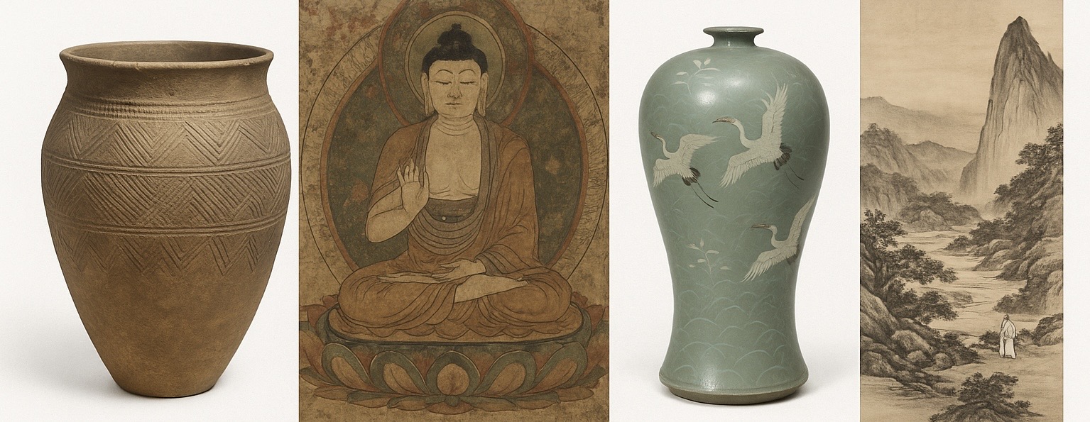 한국 미술은 오랜 역사 속에서 시대와 문화를 반영하며 독창적인 예술 세계를 구축해 왔습니다. 선사시대의 토기에서부터 조선시대의 문인화, 근현대의 민중미술과 오늘날의 K-아트까지, 한국 미술은 끊임없이 변화하면서도 고유한 정신을 지켜왔습니다. 이번 글에서는 한국 미술사의 큰 흐름을 시대별로 정리하고, 각 시대를 대표하는 예술 양식과 특징, 주요 작가와 작품을 살펴보겠습니다.